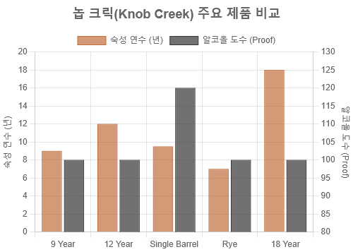 • 놉 크릭 12년 (Knob Creek 12 Year Old): 3년 더 숙성되어 한층 깊어진 복합미를 자랑합니다. 리뷰에 따르면, 풍부한 오크와 가죽, 흑설탕의 노트가 특징이며, 부드러운 질감과 긴 여운을 선사합니다.