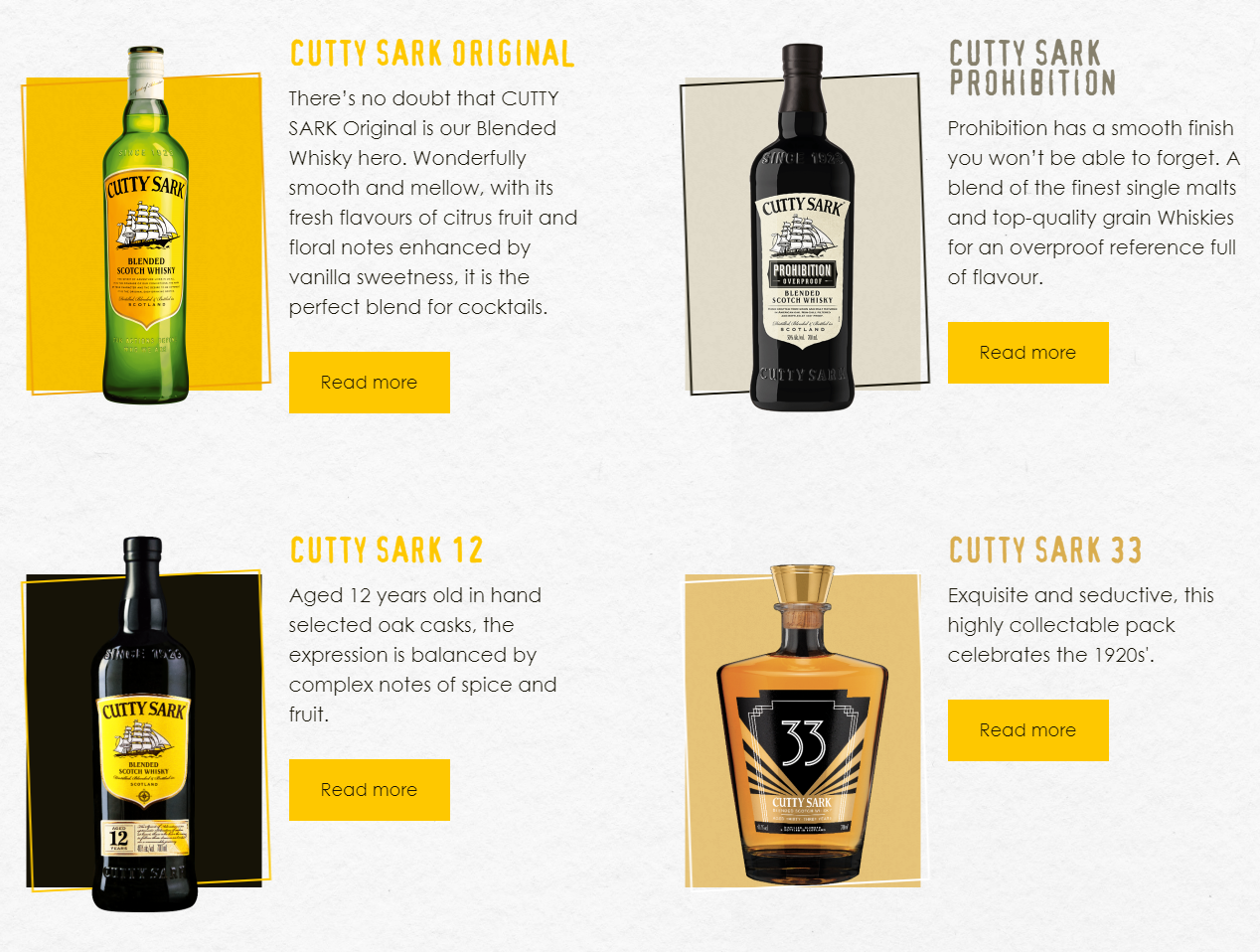 과거 커티 삭은 제품군이 다양했고 여러 가지 숙성연도를 가진 제품이 많았지만 2018년에 회사가 인수되면서 기존의 제품군을 정리하고 4개의 제품군만 생산합니다.