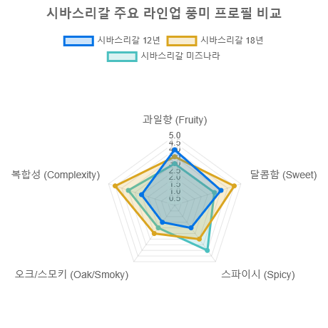 시바스리갈의 각 제품은 고유의 맛과 향을 가지고 있습니다. 주요 라인업의 특징을 차트를 통해 한눈에 비교해보고, 상세한 테이스팅 노트를 살펴보겠습니다.