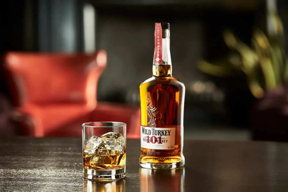 와일드 터키의 상징, 101 프루프 버번 위스키와 얼음이 담긴 잔