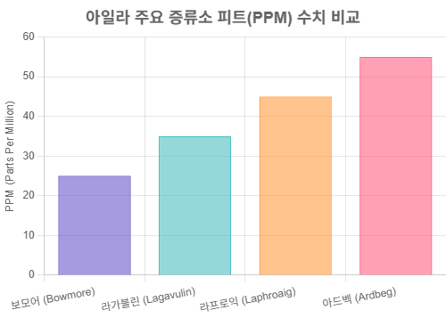 피트의 강도는 PPM(Parts Per Million)이라는 페놀 수치로 측정하는데, 이 수치가 높을수록 피트 향이 강렬합니다. 아일라 남쪽 해안의 증류소들, 예를 들어 아드벡(Ardbeg)이나 라프로익(Laphroaig)이 50ppm을 넘나드는 강렬한 피트로 '피트 몬스터'라 불리는 반면, 보모어는 약 20~25ppm 수준의 중간 피트(Medium Peated)를 유지합니다. .