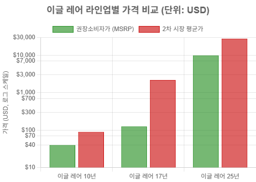 문제는 가격입니다. 이글 레어의 인기가 치솟으면서 권장소비자가는 의미를 잃은 지 오래입니다. 아래 차트는 주요 제품의 권장소비자가와 2차 시장 평균 가격을 비교한 것으로, 그 엄청난 격차를 한눈에 볼 수 있습니다.