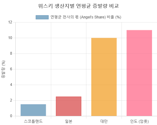 '천사의 몫(Angel's Share)' 이야기: 위스키가 오크통에서 숙성되는 동안 매년 일정량이 자연적으로 증발하는데, 이를 '천사의 몫'이라 부릅니다. 서늘한 스코틀랜드의 증발량이 연간 1~2%에 불과한 반면, 벵갈루루의 암룻 증류소에서는 연평균 10~12%라는 엄청난 양이 증발합니다. 이는 단순한 손실이 아니라, 원액의 풍미가 더욱 빠르고 강렬하게 응축되는 과정입니다. "천사들이 유독 질투하고 더 많이 훔쳐 마신 위스키"라는 감성적인 표현이 어울리는 이유입니다.