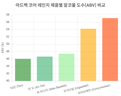 | 코리브레칸 (Corryvreckan) | 프렌치 버진 오크 캐스크 숙성. 가장 강렬하고 복잡한 '피트의 소용돌이'로, 숙련자에게 추천됩니다. | 57.1% | 후추, 에스프레소, 다크 프루트, 아니스, 타르 |