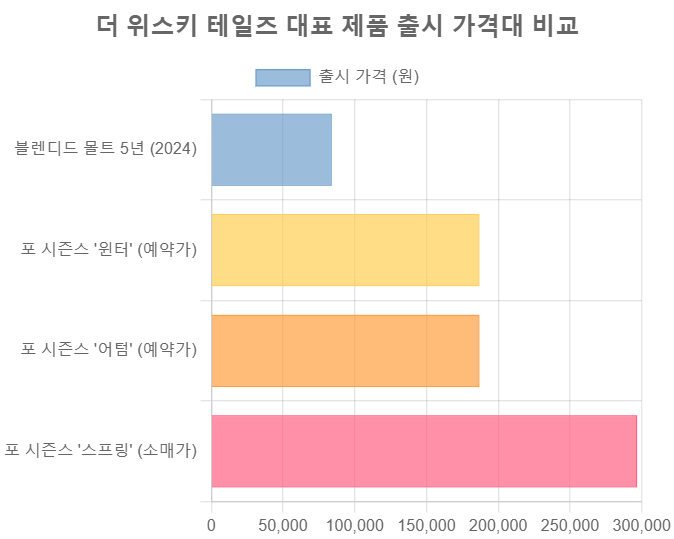 '더 위스키 테일즈'의 위스키 가격은 제품의 숙성년수, 캐스크 종류, 원액의 희소성에 따라 다양하게 책정됩니다. 예를 들어, '2024 블렌디드 몰트 5년' 제품은 예약 구매가 기준 약 84,000원(네이버 블로그 리뷰)이었던 반면, '포 시즌스' 시리즈는 제품에 따라 18만 원에서 29만 원대에 판매되었습니다(포 시즌스 어텀 예약가 187,000원, 포 시즌스 스프링 소매가 297,000원). 중요한 점은 이 가격이 '출시가'일 뿐, 한정판이라는 특성 때문에 2차 시장에서는 가치가 더 높게 평가될 수 있다는 사실입니다.